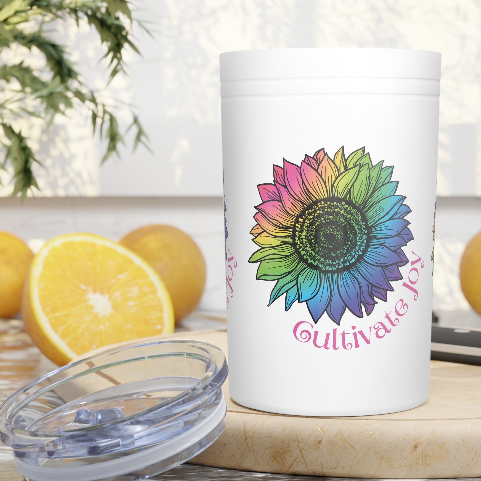 Cultivate a little extra joy every time you take a sip with our charming, 11oz, stainless steel tumbler! Great for every day use, this will also make a fabulous gift for your friends. It's not just eco-friendly, this tumbler is also double-walled and insulated to keep your drinks hot for up to 5 hours and cold for a whopping 15 hours (without condensation)! ♨️🧊 Its clear, press-on lid is BPA free and comes with a slide closure. Talk about versatility and style in one sleek package! 🌟🥤🎉 This tumbler will make everyone- and even your drinks- feel so joyful! What a cheerful, high-vibe way to get your day started!